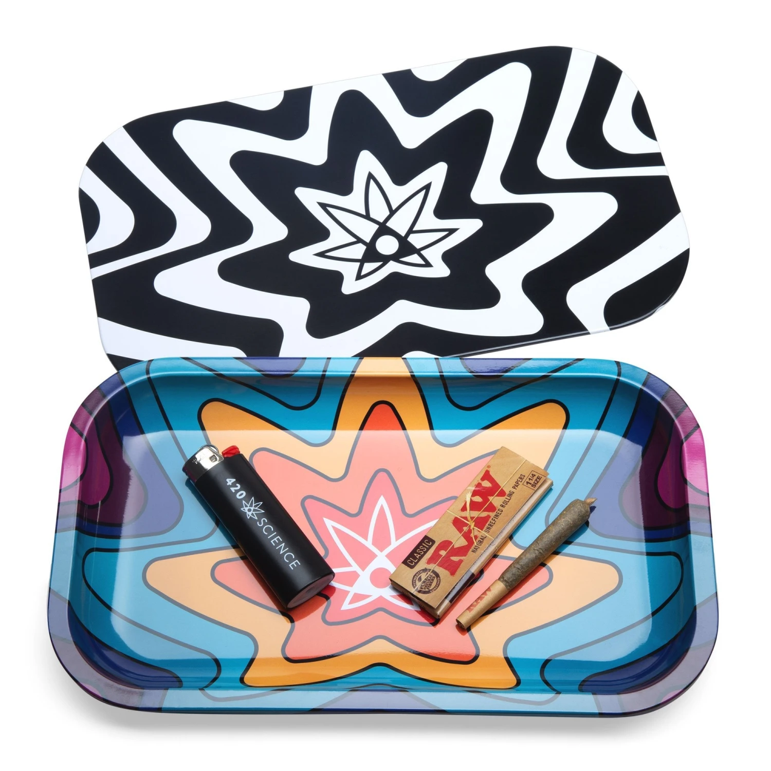This wide rolling tray keeps your tools in one place and so much more. A cool rolling tray catches all that bud you drop when you roll up a fat doobie so you can use it again. But ordinary trays can also catch dust and other particles floating in the air. Our tray has a magnetic lid that snaps onto the rim of the tray keeping out unwanted debris. We also have an optional custom fitted silicone insert that can be used to turn the tray into a dual purpose dab station. This tray is emblazoned with our 420 Science logo so that obviously makes it special, magical, and will make your life better in some way, we’re sure of it.