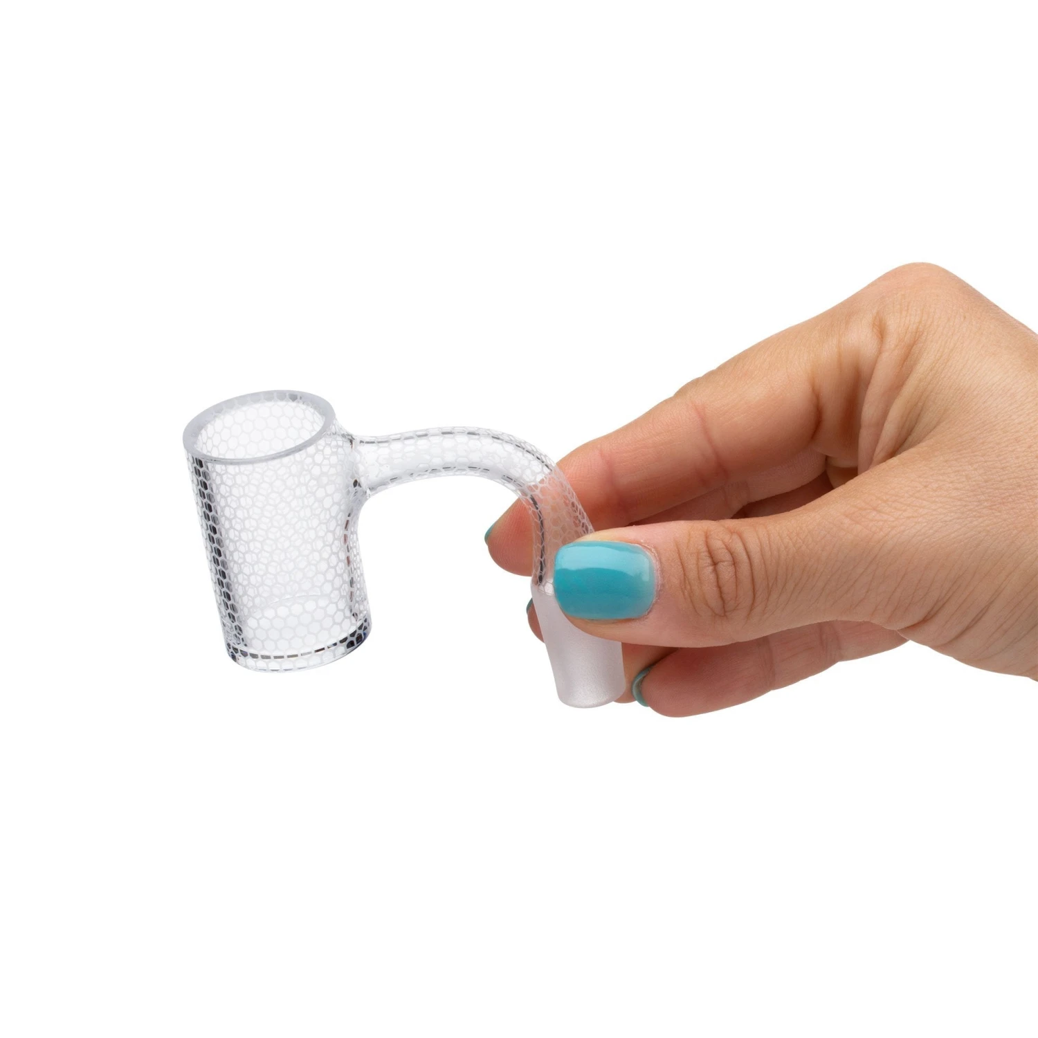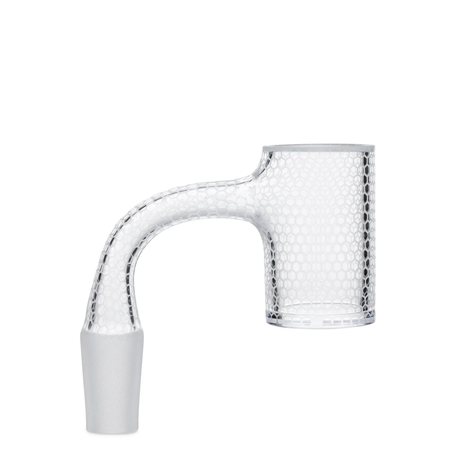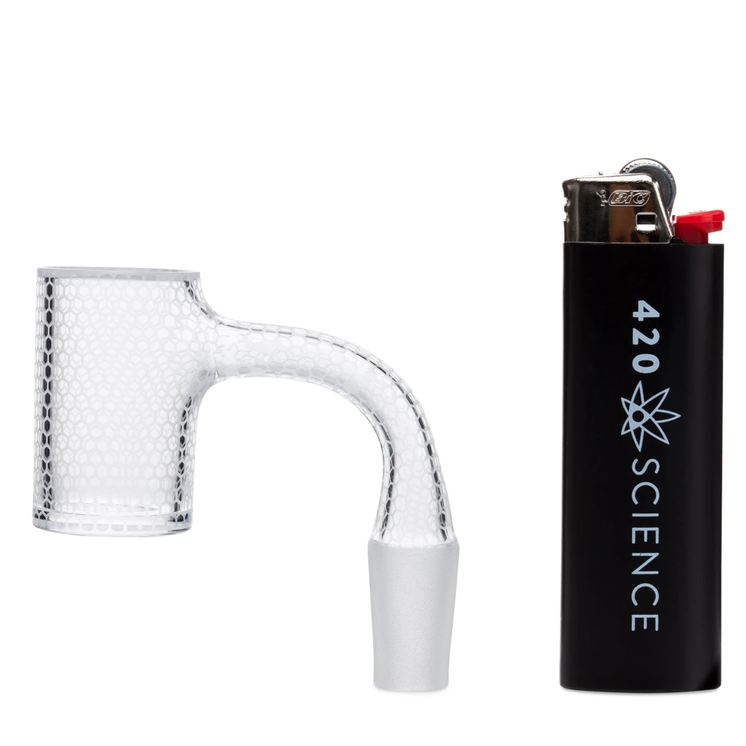 A flat-top banger makes dabbing easy by having a balanced surface to drop your carb cap on. This full-sized quartz banger is adorned with etched details that draw a sprawling landscape of linework across the banger. The honeycomb etched pattern on the banger is a classic geometric symbol that is often associated with dabbing and cannabis concentrates. The banger has a thicker bottom for heat retention and works well for standard or cold start dabbing.