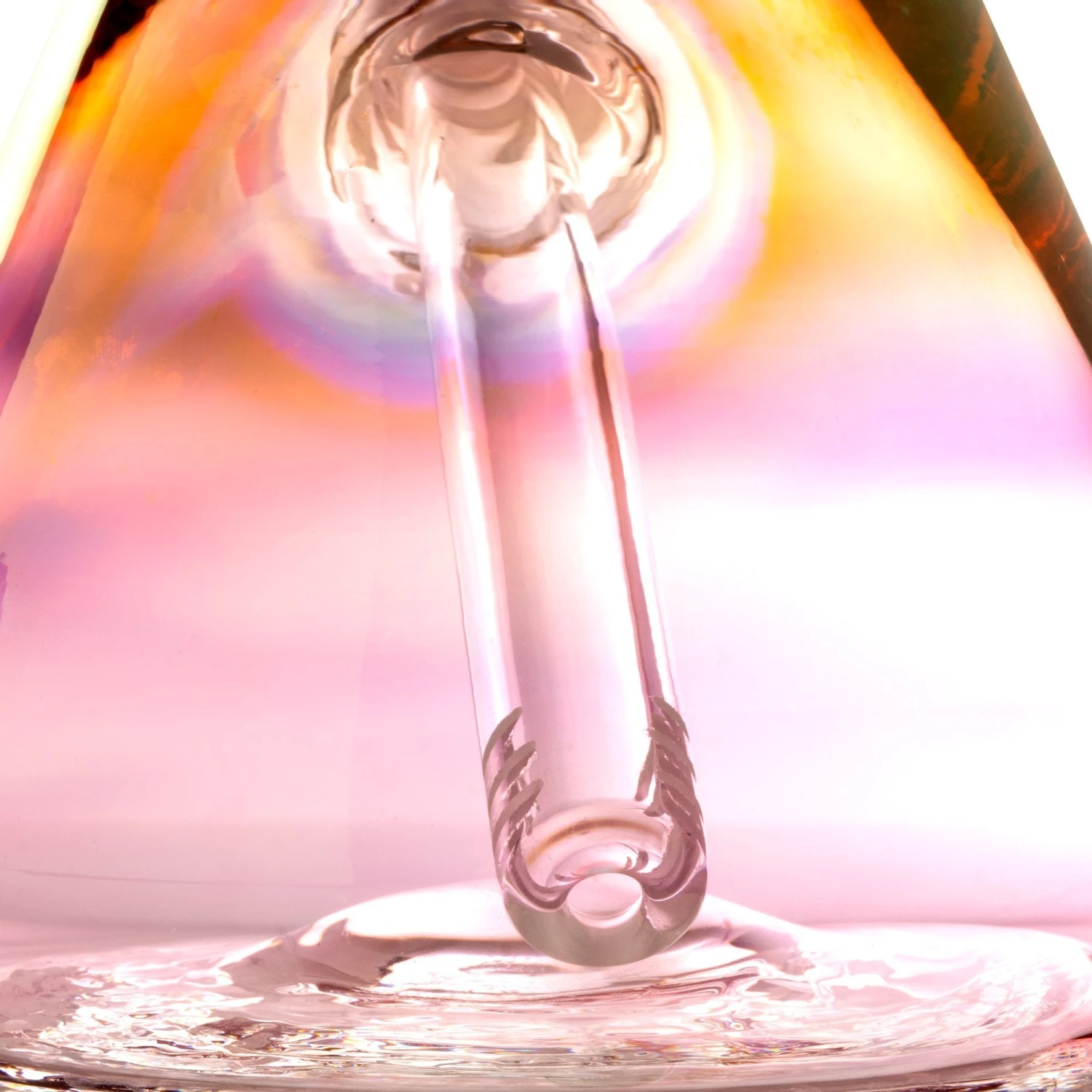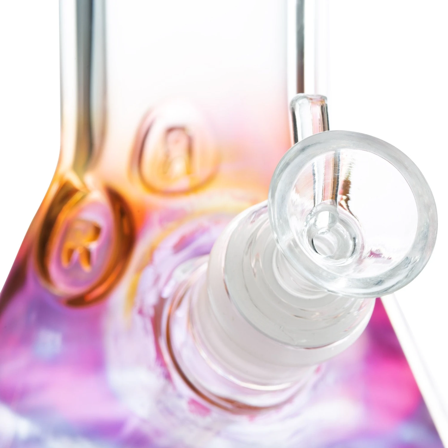 It can be hard to find a perfectly executed color fading glass bong, but Raven knows how to execute this technique with precision and care. Raven Glass is a gorgeous example of excellent craftsmanship and color application. This beaker base has a body with colors that fade from warm to cool. This bong is a gorgeous daily driver for a collector or anyone looking for a piece that can sit out and look beautiful.