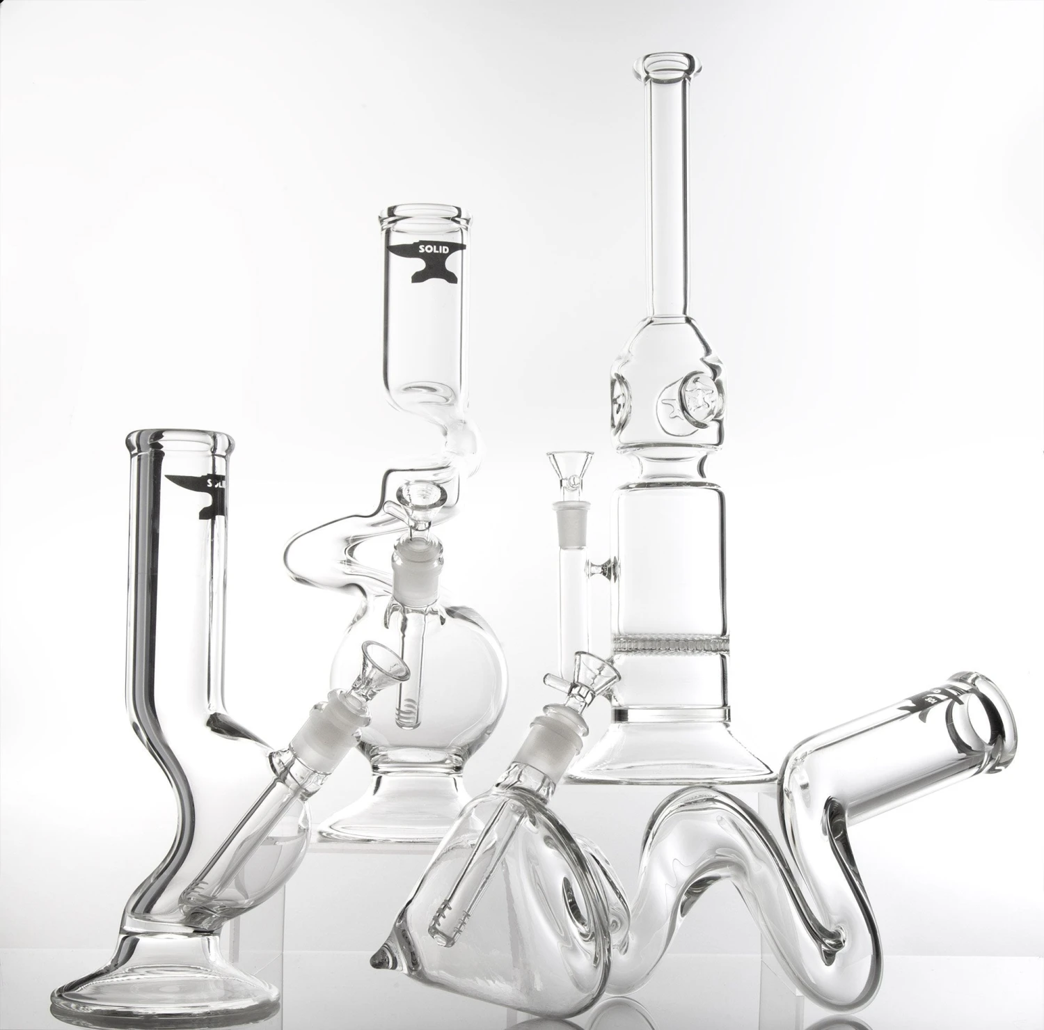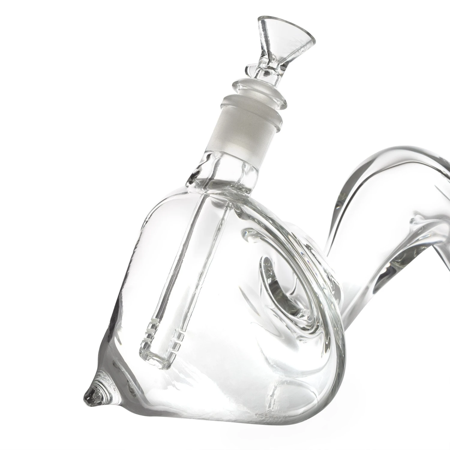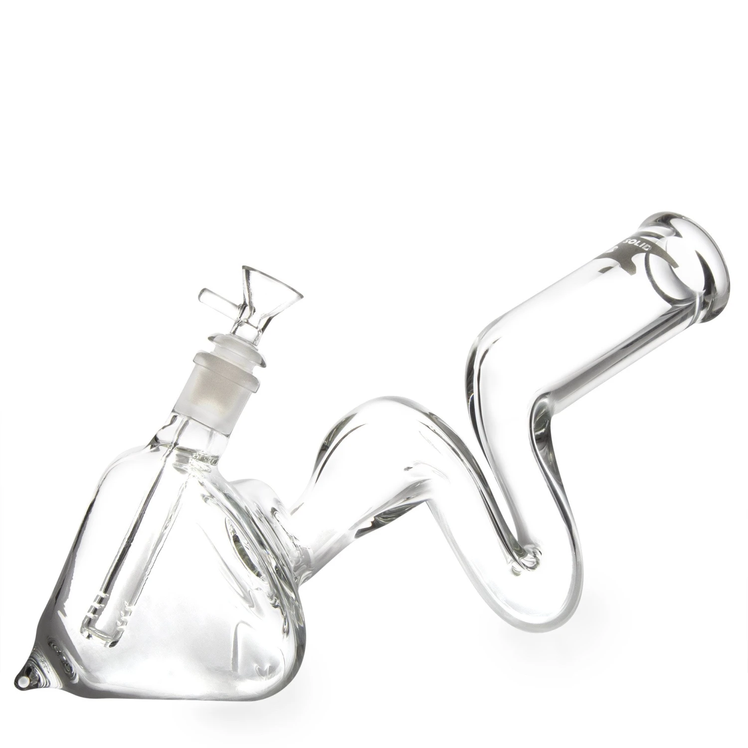 Well, now we’ve seen everything. The Couch Potato bong from Solid is on a whole other level. This water pipe sits on its side perfectly balanced like a lazy glass pipe waiting for someone to smoke it. It props itself up on an elbow bend in the glass. You can pick it up and use it or get down on its low level and take a hit that way if you want. This bong is absolutely a conversation piece. At first glance, it looks like your water pipe has fallen on its side, but that’s just how this bong sits. The curvy mouthpiece prevents backsplash and looks awesome.