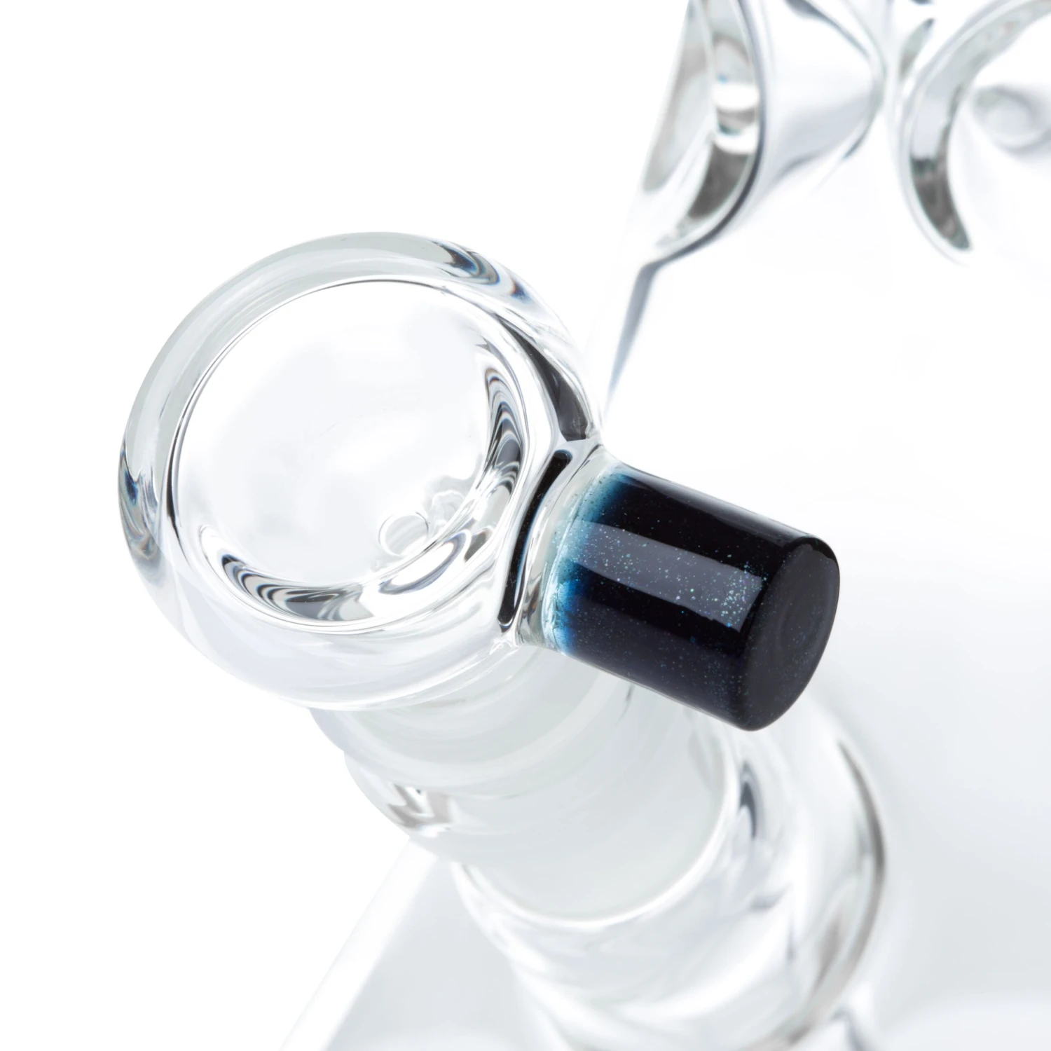 This tall beaker has an extra-wide base to ensure stability and plenty of room to build up a huge rip. The triple-pinch ice-catch is set low in the neck to encourage lots of ice in the tube. The addition of color to the neck and bowl as well as the signature double lines make these glass pipes stand out.
